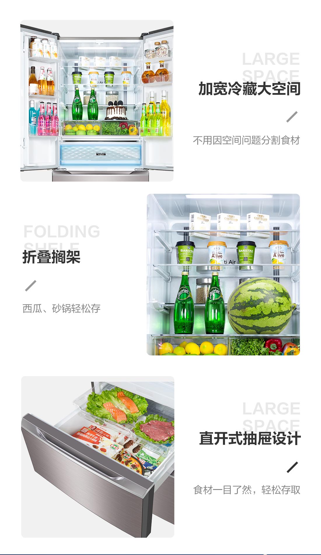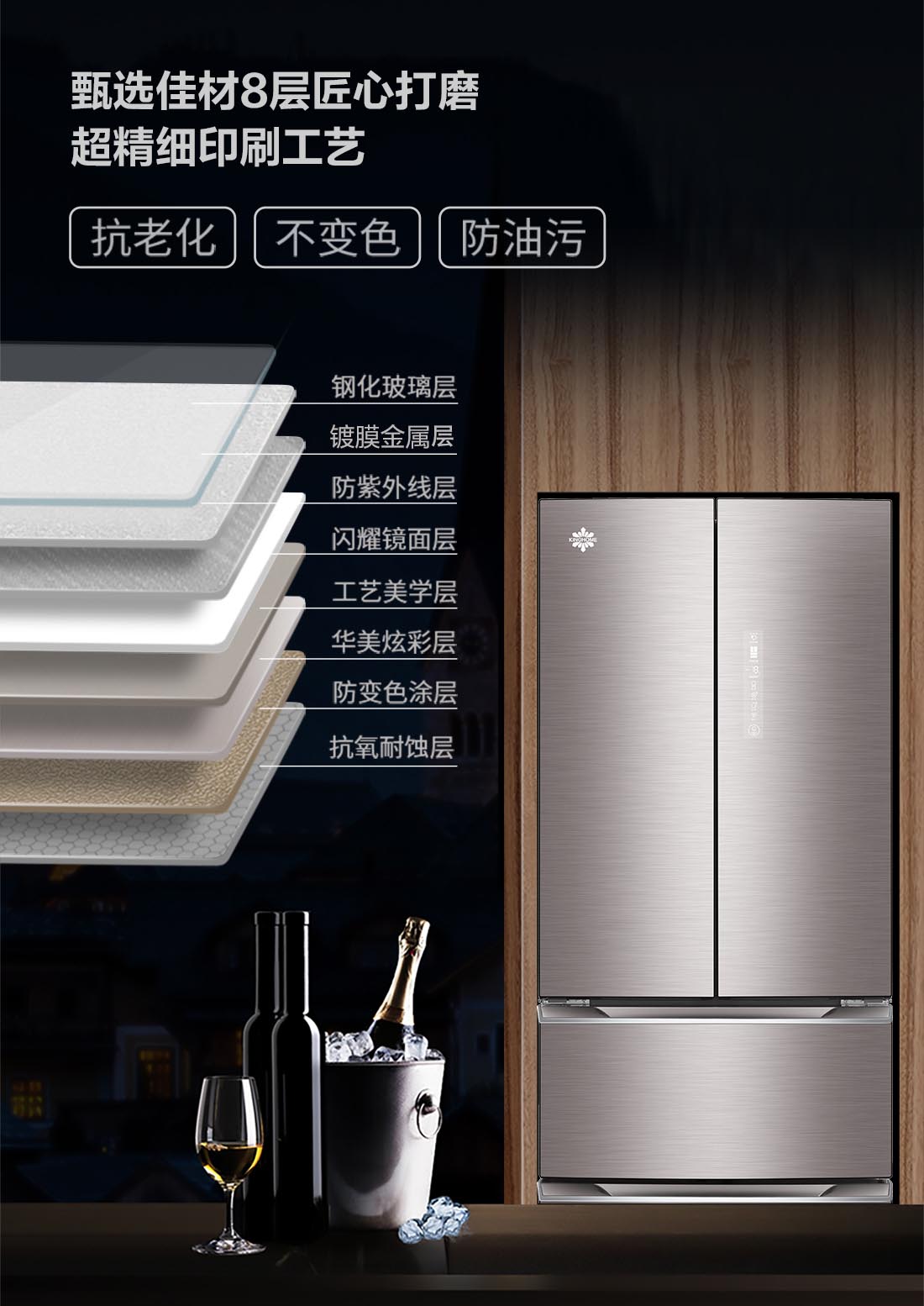 搭載-5℃瞬凍黑科技,鮮嫩兩星期,輕松一刀切。細(xì)胞級(jí)養(yǎng)鮮,營養(yǎng)流失少。搭載-3℃嫩凍黑科技,食材不結(jié)冰,鮮嫩一整周。智能全變頻技術(shù),恒溫保鮮,節(jié)能靜音。